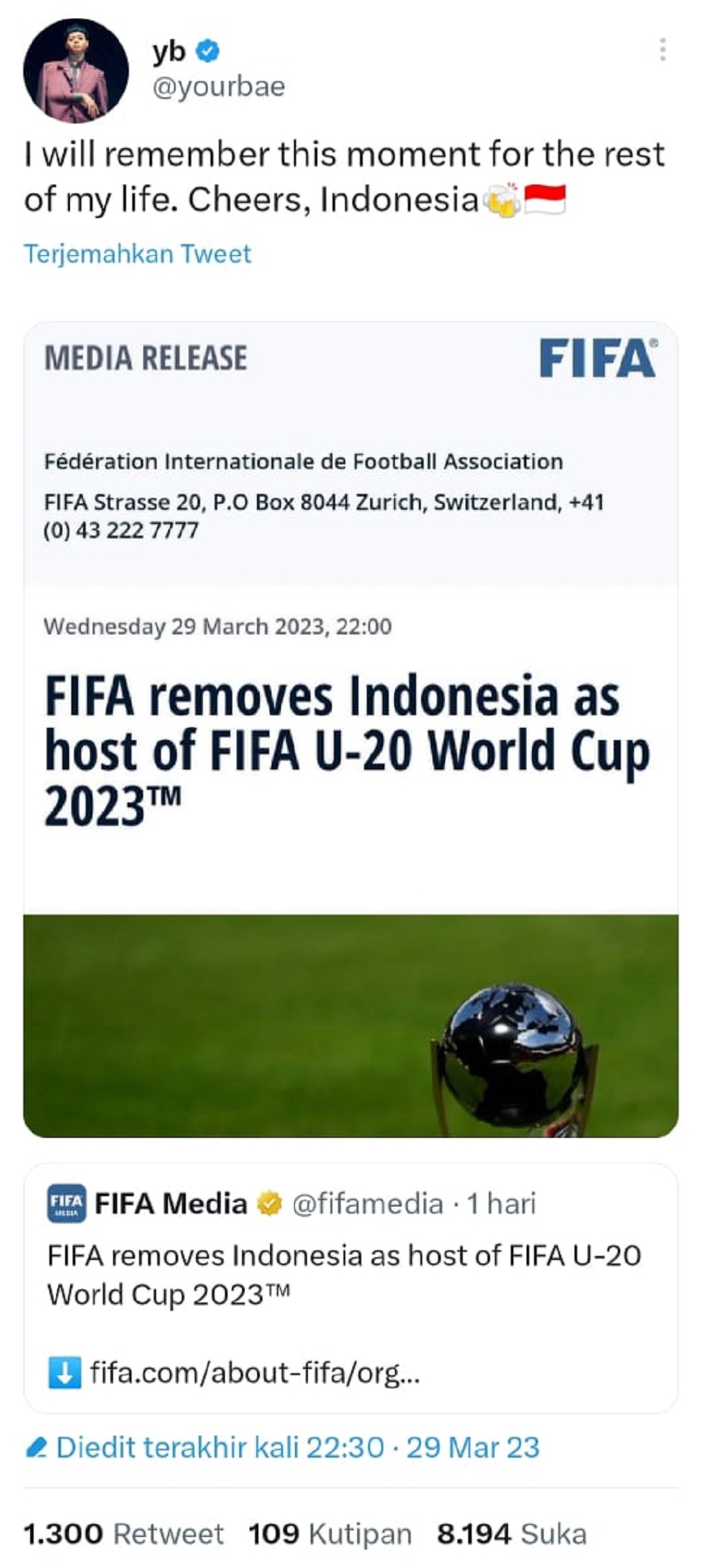 Jakarta, ebcmedia – Reza Oktovian atau biasa di kenal di sosial media sebagai Reza Arap tak bisa menerima rasa kecewanya saat FIFA memutuskan bahwa Indonesia sendiri batal menjadi sebagai tuan rumah di ajang Piala Dunia U-20.