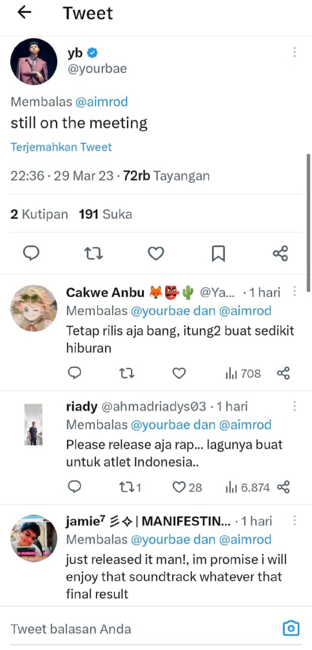 Cuitan tersebut kemudian membuat reaksi dari netizen. Salah satunya, yang menanyakan tentang sebuah lagu Glorius yang melibatkan Reza Arap dan juga Weird Genius bakal tetap dirilis atau tidak.
