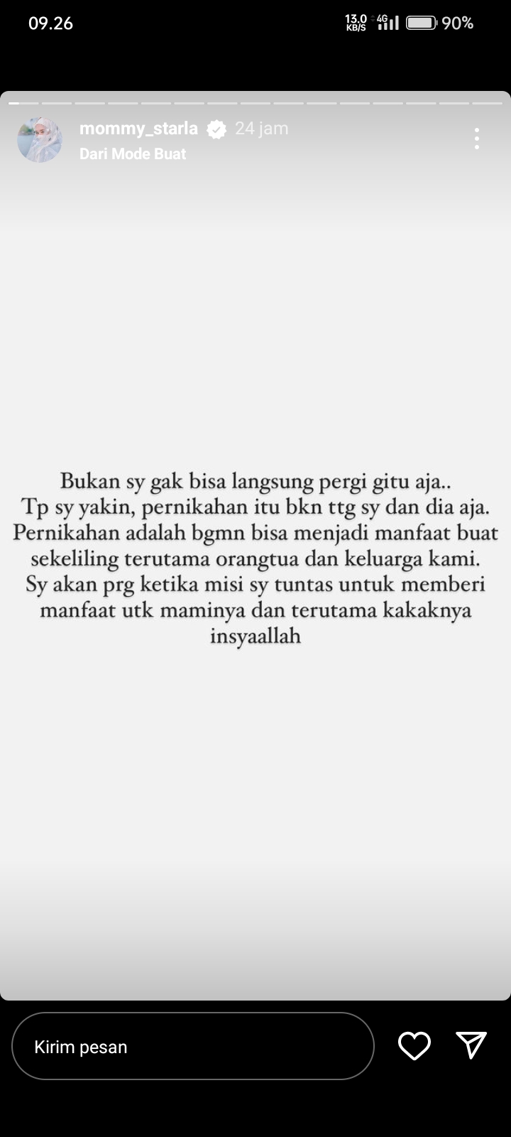 “Bukan saya gak bisa langsung pergi gitu aja. Tapi saya yakin, pernikahan itu bukan tentang saya dan dia saja. Pernikahan adalah bagaimana bisa menjadi manfaat buat sekeliling terutama orangtua dan keluarga kami. Saya akan pergi ketika misi saya tuntas untuk memberi manfaat untuk maminya dan terutama kakaknya insyallah”. Dikutip dari Instastory @mommy_starla. *** rz/sr
