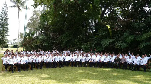 Kemudian, di akhir acara pengarahan tersebut Prabowo bersama para Menteri dan Wakil Menterinya berfoto bersama dan kompak menyuarakan yel-yel.