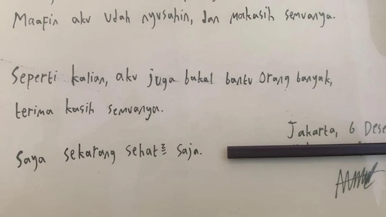 “Maafin aku udah nyusahin dan makasih semuanya. Seperti kalian, aku juga bakal bantu orang banyak. Terima kasih semuanya. Saya sehat-sehat saja,” tulis MAS dalam suratnya.