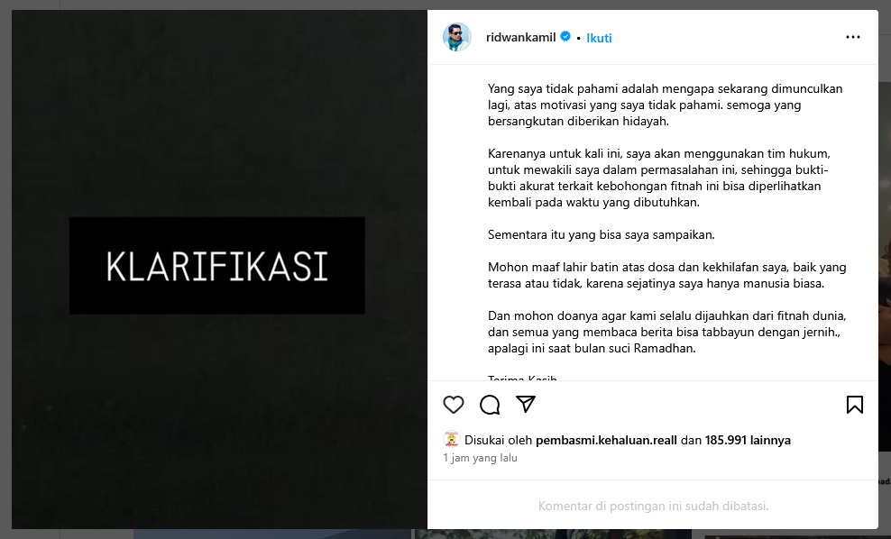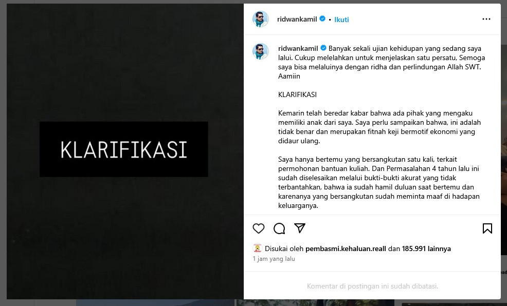 Melalui unggahan tersebut Ridwan Kamil juga mengungkapkan bahwa permasalahan mereka sudah selesai melalui bukti-bukti akurat bahkan Lisa Mariana telah hamil duluan.