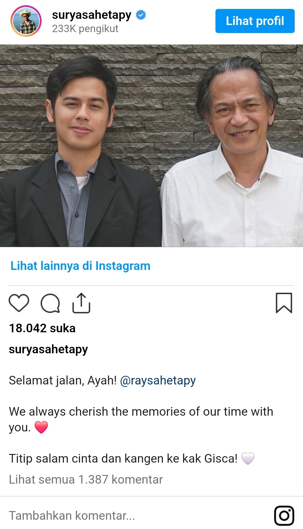 “Selamat jalan, Ayah! @raysahetapy. We always cherish the memories of our time with you. ❤️ Titip salam cinta dan kangen ke kak Gisca! 🤍,” tulis Surya Sahetapy, Selasa (1/4/2025).