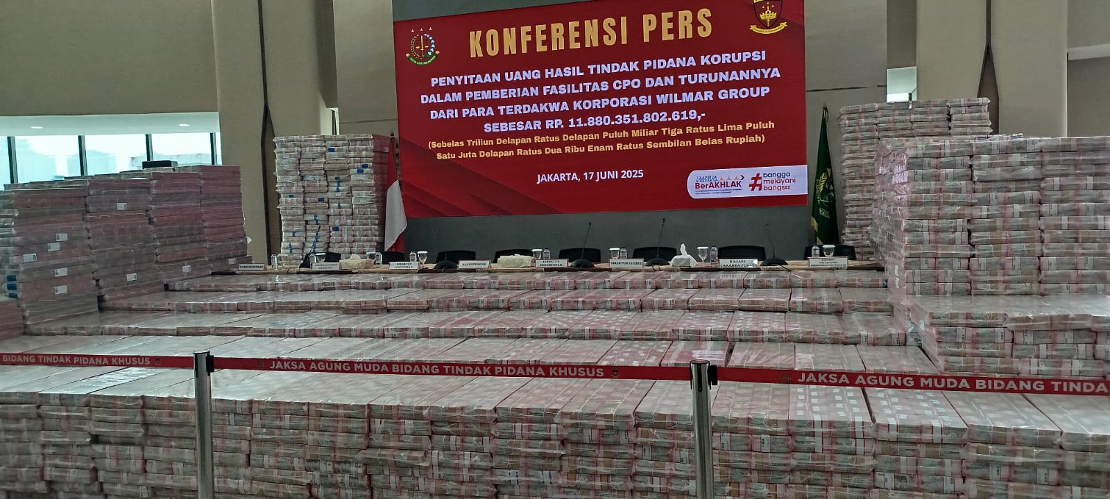 Jakarta, ebcmedia – Kejaksaan Agung (Kejagung) menunjukkan barang bukti berupa uang tunai senilai Rp 11,8 triliun yang disita dalam kasus dugaan korupsi ekspor crude palm oil (CPO) atau bahan baku minyak goreng. Uang sitaan tersebut diperlihatkan kepada publik saat konferensi pers di Gedung Bundar, Kejagung, Jakarta Selatan, Senin (17/6/2025).