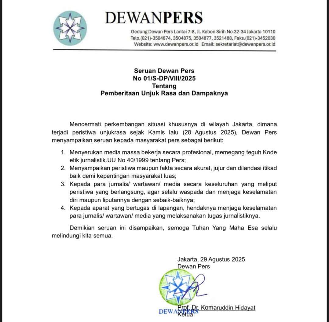 Jakarta, ebcmedia.id – Dewan Pers mengeluarkan seruan resmi terkait pemberitaan aksi unjuk rasa yang terjadi di Jakarta sejak Kamis (28/8/2025). Seruan ini dituangkan dalam Surat Nomor 01/S-DP/VIII/2025 tentang Pemberitaan Unjuk Rasa dan Dampaknya.