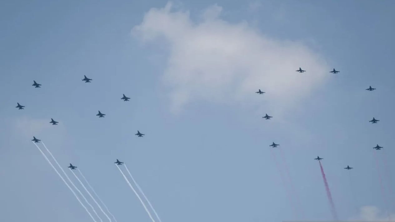 “Kita akan saksikan bersama penampilan flight F-16 Fighting Falcon TNI dengan call sign Naga Fly yang akan melakukan manuver High G Turn. Aksi ini menjadi simbol semangat para prajurit TNI dalam menjaga kedaulatan negara,” ujar narator dari pengeras suara di area upacara.